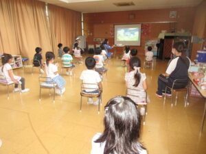 コロナ禍の中ですが、会場や子どもたちの座席の取り方などについて須磨警察署の方と相談しながら準備をし、交通安全教室を行いました。