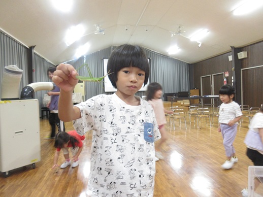 「みて!こんにちわってしてる!」「かわいい!」とバッタの両足を優しく持って、バッタが上下に動く様子を楽しんだり「眠れ~眠れ~!」「かえるさん眠った」「おやすみかえるさん!」とかえるを両手で優しく包み込み、お腹が上になるように手のひらをひっくり返すと、眠ったように動かなくなるかえるとの触れ合いを楽しんだり、どの虫・生き物コーナーも子どもたちの楽しい声でいっぱいでした。