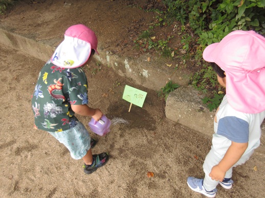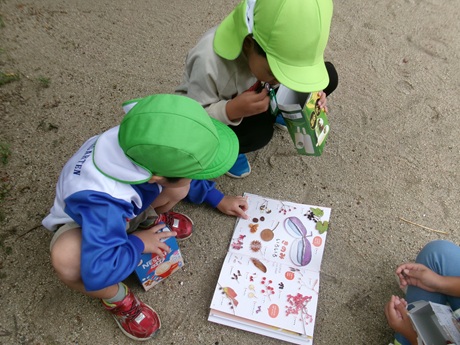 年長児は図鑑をもって出かけ、気になった木の実や葉の名前を調べたり、年中児は落ちている柿の種を集め「植えたら柿の木になるかな?」「柿がいっぱいの幼稚園にしようよ!」と園庭の隅に植えて育てることにしました。