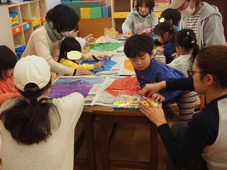 今回の未就園児教室「つくし組」では、満3歳児クラス「ちゅうりっぷ組」の友達と一緒に凧を作りました。