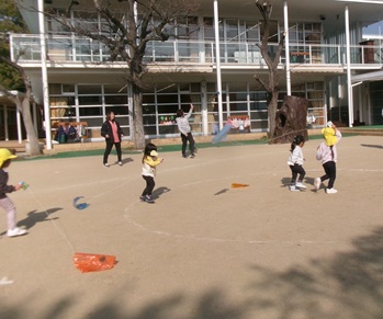 「何かこうかな?」「ハートかきたい!」と自由に好きな絵を描いた後は、ストローをビニールに貼るという少し難しいことをしたのですが、「自分でやる!」とやる気満々!ストローを付けたら、ひもを結んででき上りです。広い園庭にみんなで行って、走ると凧が空にあがって大喜び!何度も何度も走って、凧揚げを楽しみました。